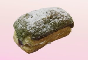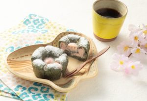 青々とした爽やかな香りのよもぎ生地に、甘酸っぱい苺のチーズクリームを包み込みめました