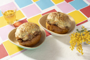 新たまねぎと地鶏サラダをサンドし、表面をチーズでパリッと焼き上げたパニーニに