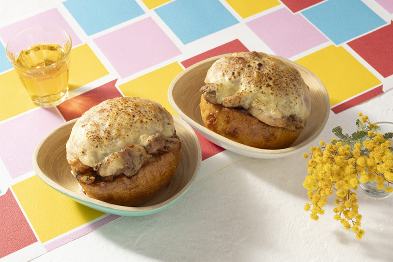 ジューシーチキンとオニオンマヨソースを挟んだハード系のパンに豪快にチーズをたっぷりと!