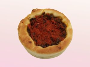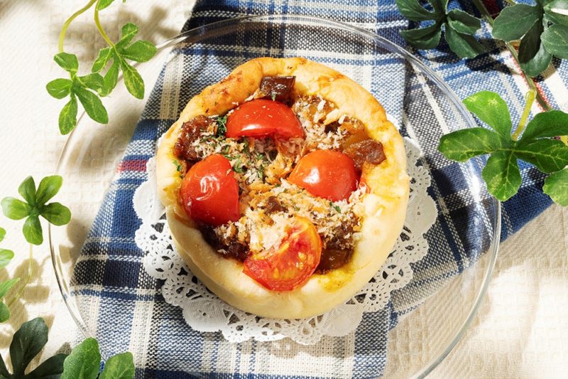 トマトを練り込んだパンに自家製ボロネーゼソースとナスを乗せて焼き上げました